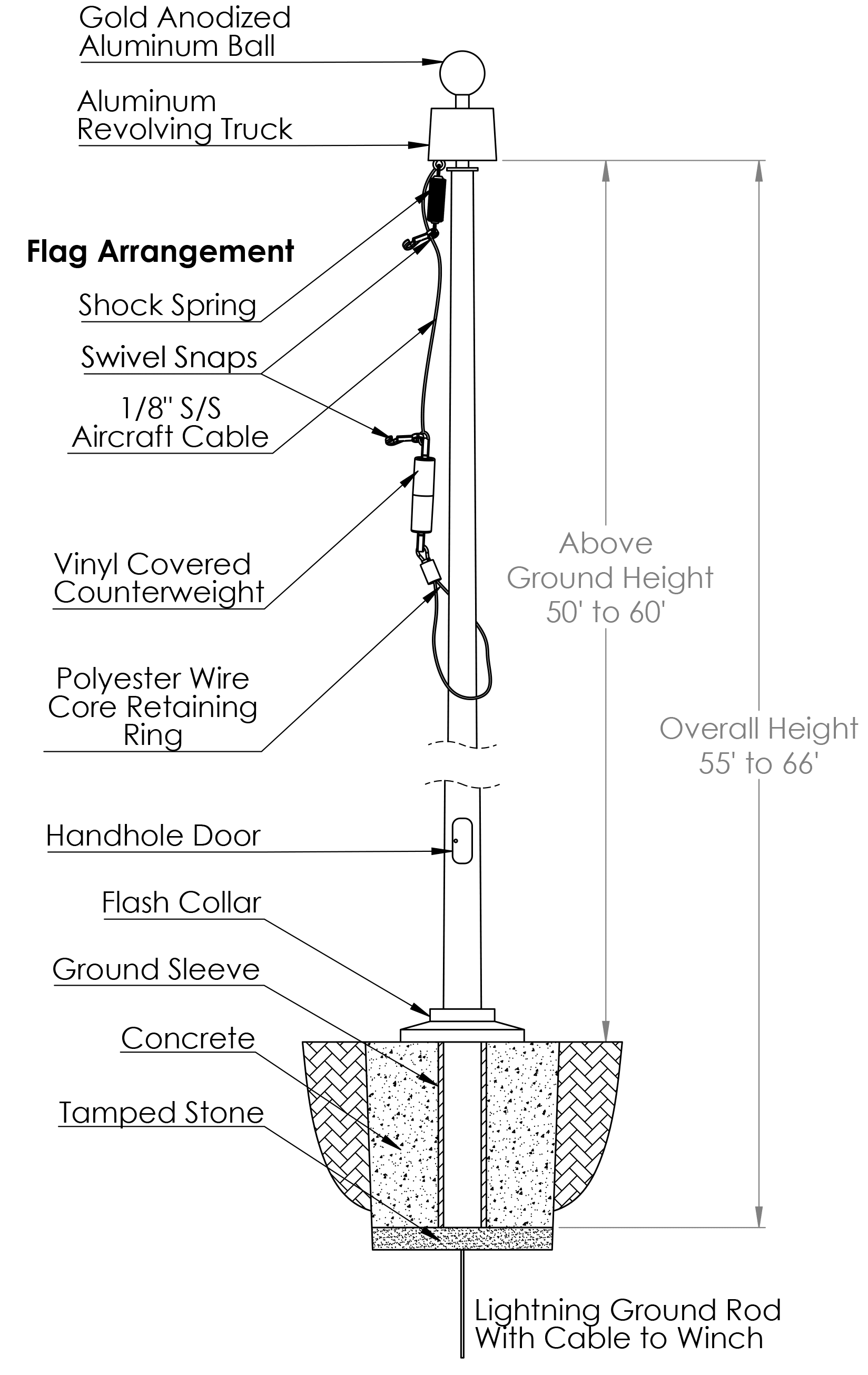 Poles 50’ and 60’ are equipped with an internal field splice which is cemented and pinned with stainless pins to the bottom section. The top section simply slides over the self-aligning splice for easy field assembly.